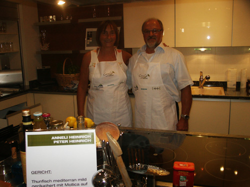 Die Vertiefung im Boden des Räucherofens mit Räuchermehl, getr. Thymian und Rosmarin füllen, die Thunfischsteaks aus dem Olivenöl nehmen, abtropfen lassen, auf den Rost legen und etwa 10-15 min räuchern.