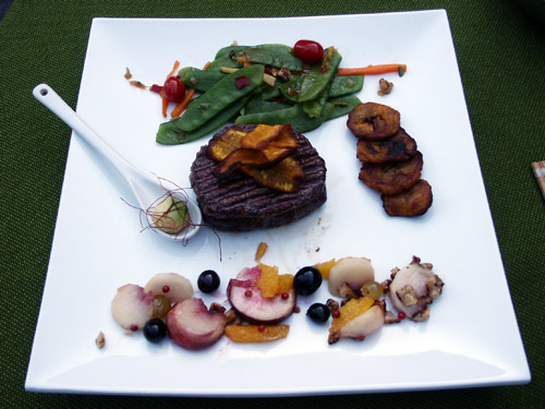 auf "cedar plank" glasiert mit einer Reduktion von "Gallo Merlot" In Annatto-Biskinöl gebratenen Gemüsebananen "Pese", umgeben von einer bunten pikanten Gemüse Frucht Mischung aus" Californias Gärten"